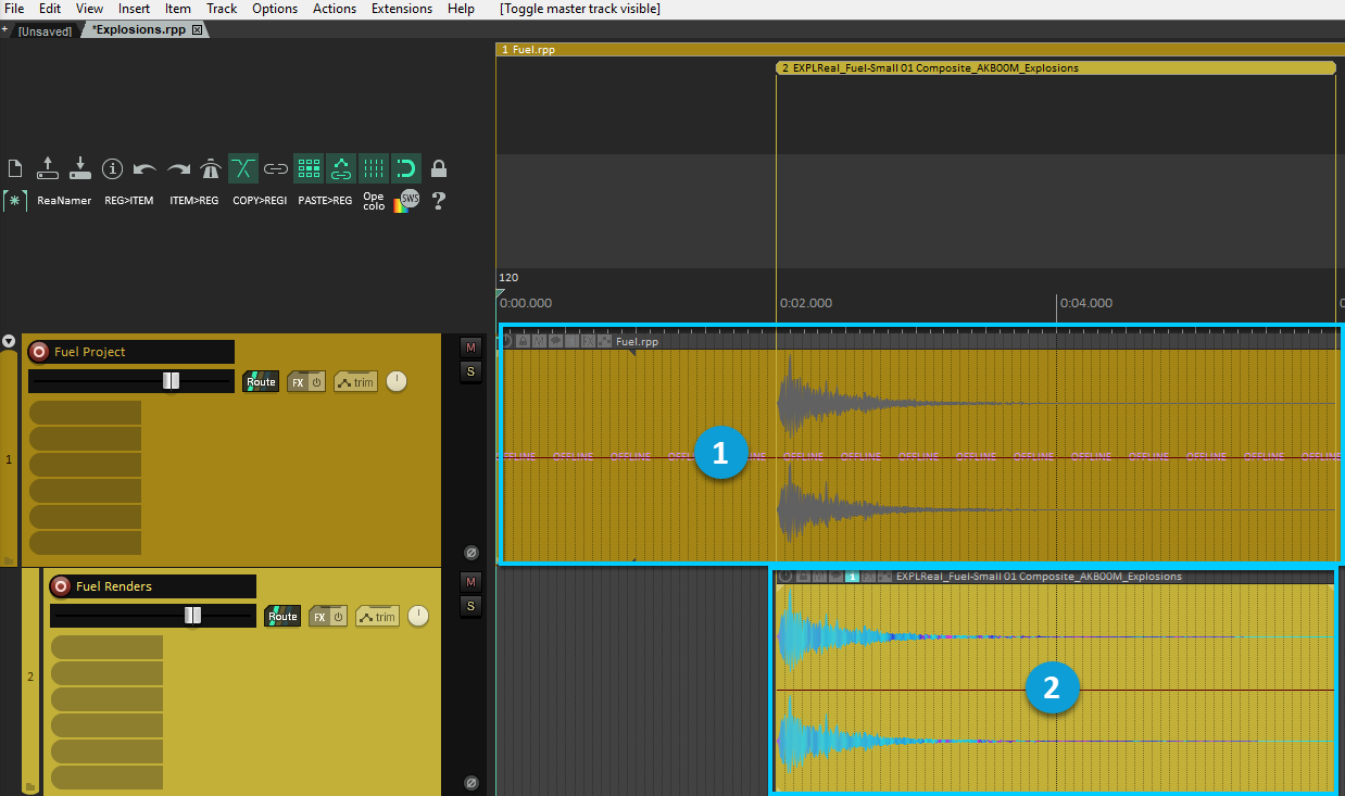 主工程便于显示、查找并试听 Creature 合集中的各种声音。主工程中包含与每个子工程对应的音轨,以及在嵌套音轨中引用各个子工程的媒体项。您可以根据需要随意试听媒体项,其引用了对应子工程的一组渲染输出。